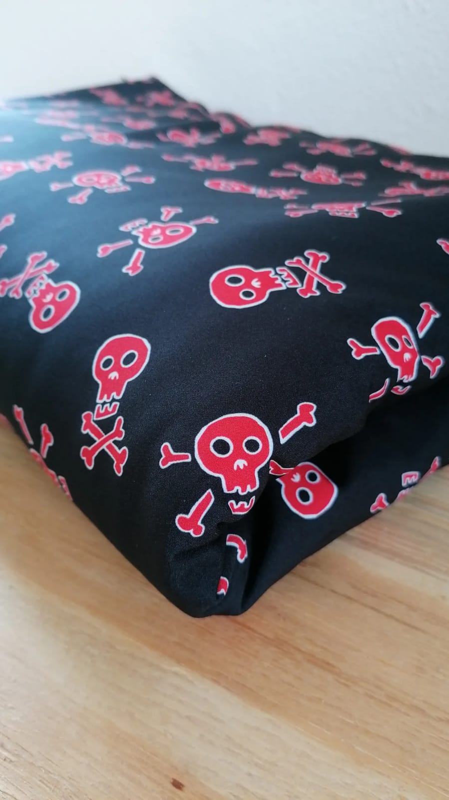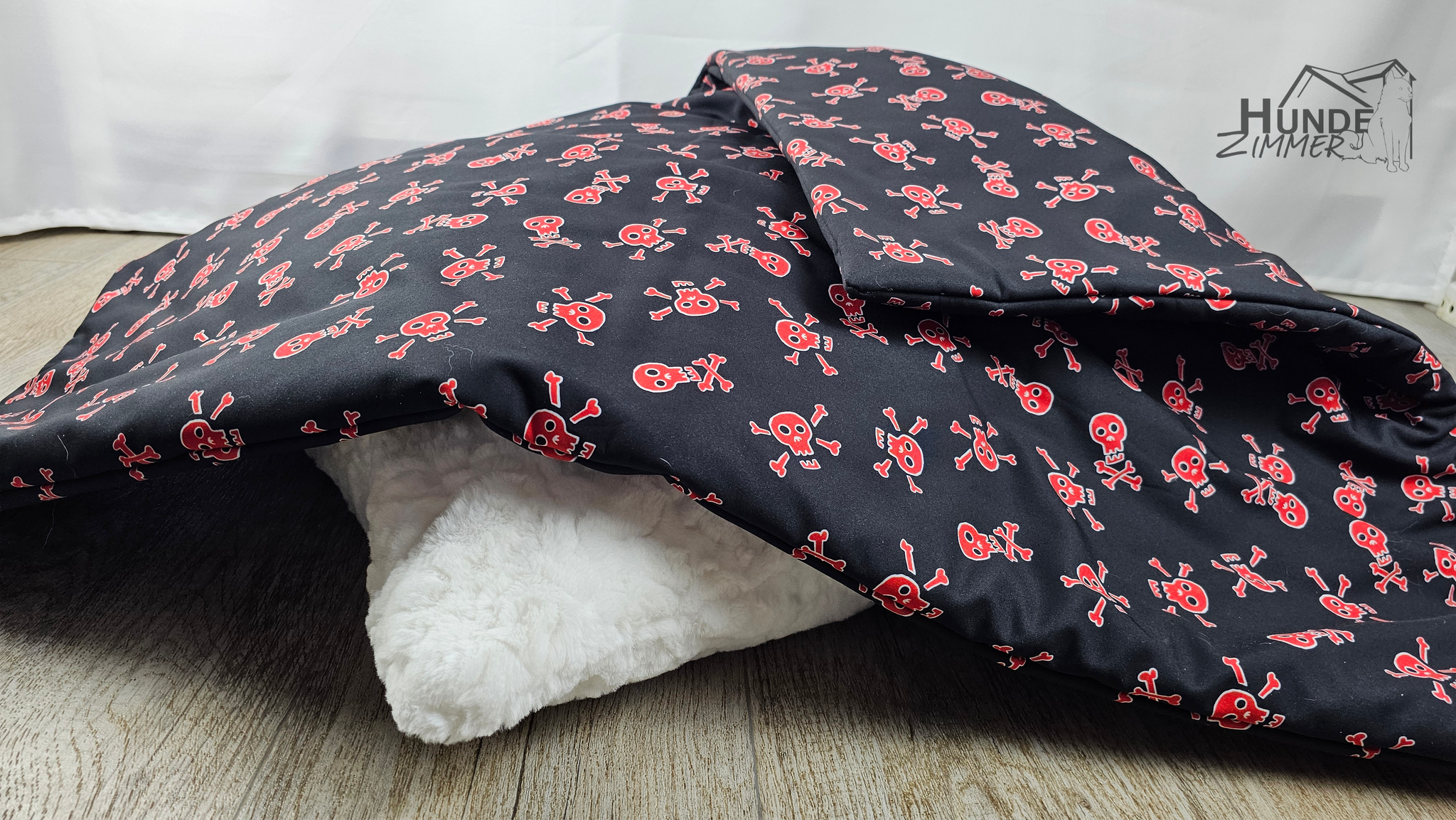Diese Softshell-Hundedecke mit roten Totenkopf-Design auf schwarzem Hintergrund ist perfekt für kleine Abenteurer! Robust und stylisch, bietet sie gemütlichen Komfort für alle Hunde, die gerne auf Schatzsuche gehen. Ahoi, Kuschelkurs voraus